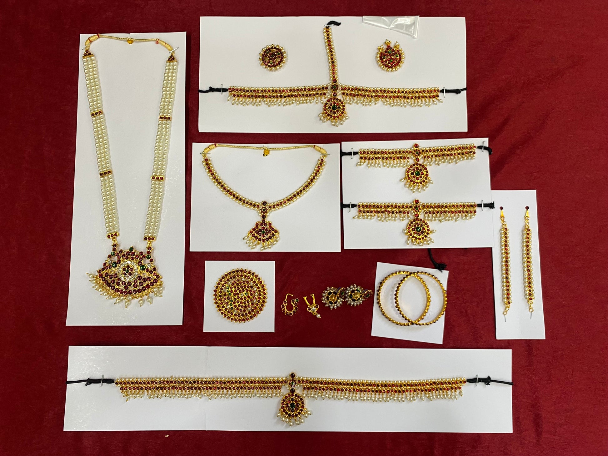 - Total 10 items along with Headset (including sun & moon), Short Necklace,Haram, Bajuband, Ragadi, Bangles, Mattil, Jumka, Belt and Nathu bullakku