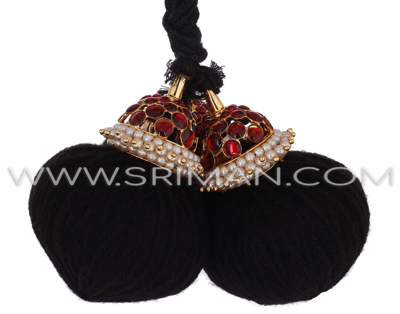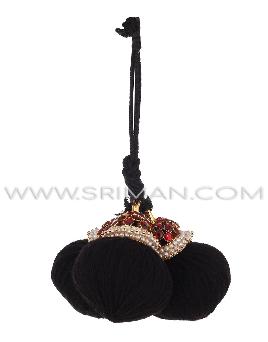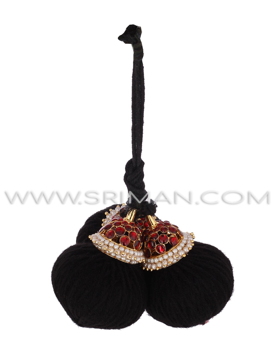 This is a round Kunjalam designed to match the Bharatanatyam temple jewelry set. This Kunjalam can also be used for Kuchipudi dance performance. Kunjalam is usually tied at the end of the hair braid to add appeal to the hair.